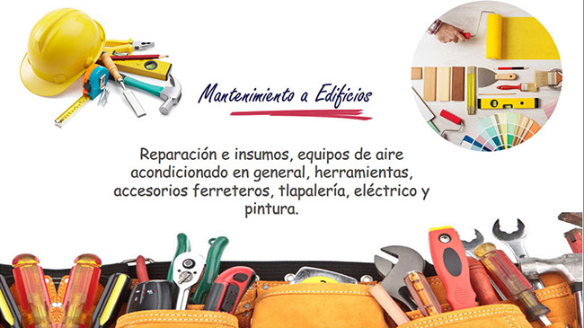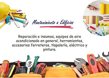 Reparación e insumos para mantenimiento de edificios, equipos de aire acondicionado en general, herramientas, accesorios ferreteros, tlapalería, eléctrico y pintura.
